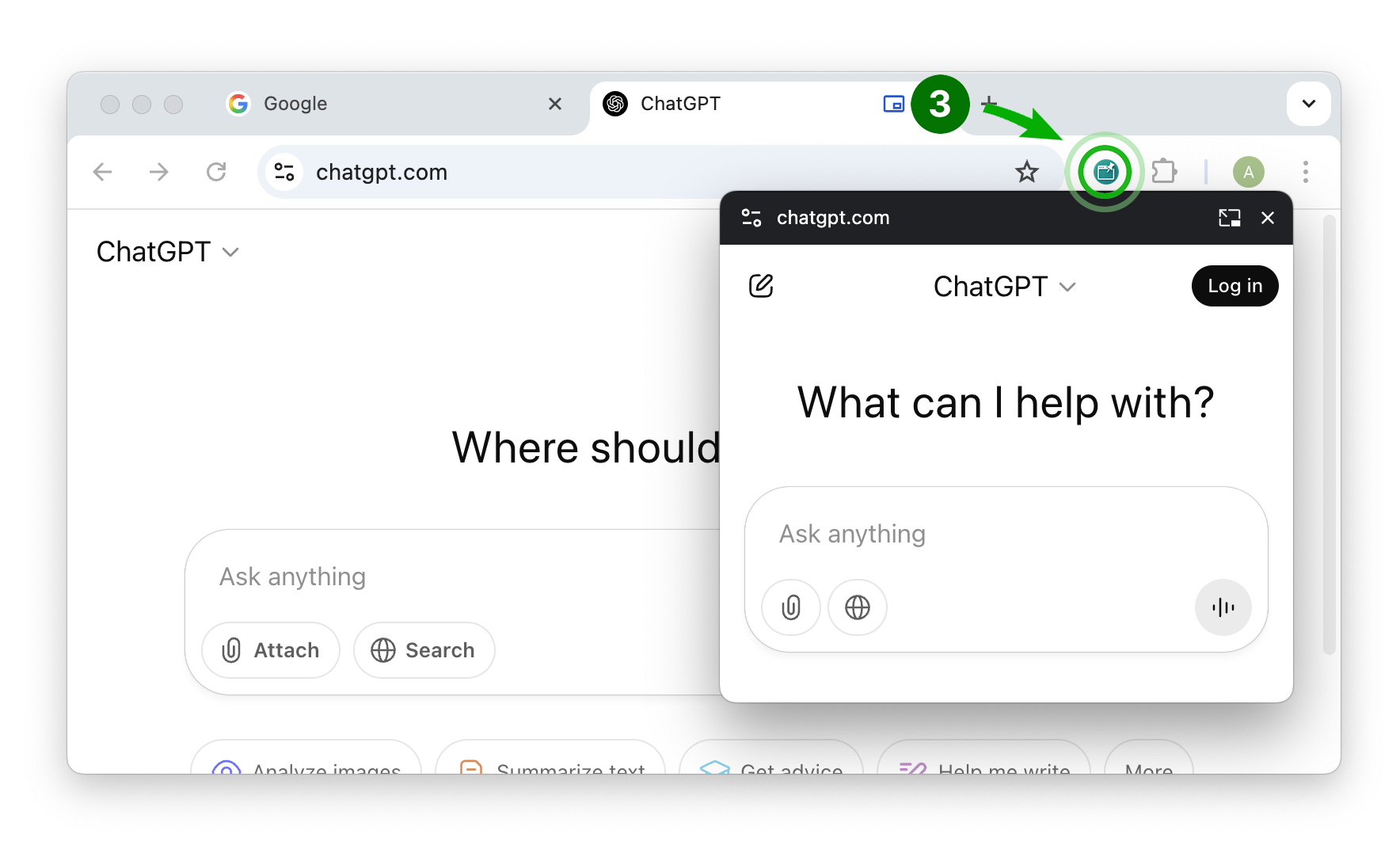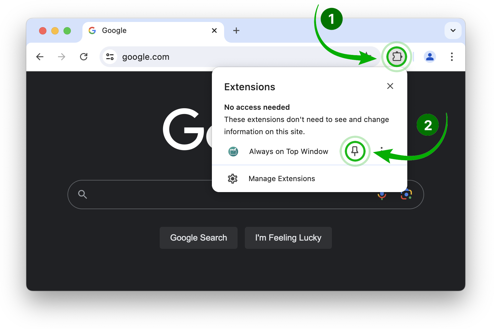 To access the tool quickly, click the puzzle icon (1) in the top-right corner of your browser. Then, click the pin icon (2) next to the extension: